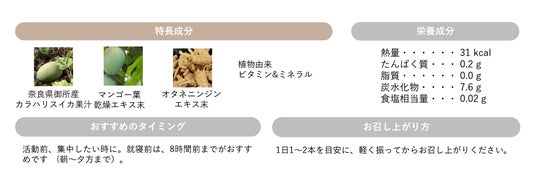 キレイとエネルギーをチャージする、天然由来原料99%でできた美容系エナジードリンクです。カフェイン代替成分として注目されるマンゴー葉エキスが働くノンカフェインで、もうひとがんばりしたい夕方にも。厳しい環境を生き抜く、保水力の高いカラハリ砂漠原産のカラハリスイカ抽出成分や朝鮮人参エキスで、元気と美しさをサポートします。
