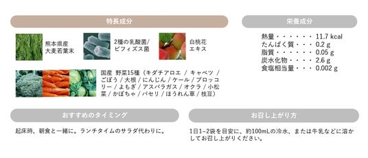 グルテンフリーになって、さらにやさしく。スティック個包装でいつでもどこでも、気軽に摂れるパウダータイプのグリーンスムージーです。収穫から3~9時間で粉砕される新鮮な大麦若葉に加え、15種類の国産野菜をぎゅっと凝縮。生きて腸まで届く2種の乳酸菌(有胞子性乳酸菌 / カゼイ菌)とビフィズス菌にプラス、白桃花エキス配合で、菌の定着率にもこだわりました。素材が持つ、自然な甘さです。