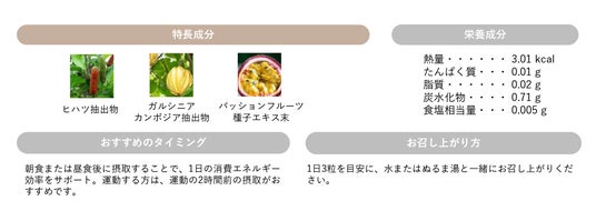 ヒハツ抽出物、ガルシニアカンボジア抽出物、そしてパッションフルーツ種子エキス。エキゾチックな3つの成分によるトリプル作用で、歩く、階段を上るなど日常の動きを効率化するサプリです。一日の始まりの朝食後や昼食後の摂取で、日常行動によるエネルギー消費を一日中効率よく。運動時は2時間前の摂取がおすすめです。