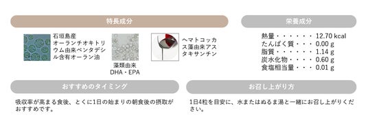 “海のカロテノイド”と呼ばれる、アスタキサンチンの赤い色が印象的なオイルサプリです。特長成分であるオーラン油は、健康維持効果で注目されている微細藻類オーランチオキトリウムから抽出。石垣島沿岸で採取し、培養しました。さらに、藻類由来のDHA・EPAが健やかさと美容をサポート。含有成分はもちろん、ソフトカプセルまで植物性の天然由来100%です。