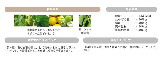 たんぱく質などの働きをスムーズにするビタミンと、体の機能を助けるミネラル。現代人に不足しがちな2つの成分を、天然素材から水で抽出。バランス良く配合し、健やかさをサポートするナチュラルなサプリメントです。1日4粒で、サラダボウル約1杯分のビタミン&ミネラルの摂取が可能。吸収スピードの速い従来型と、長く留まるリポソーム型の2種の配合で、排出されやすいビタミンCが体内にゆっくり留まります。