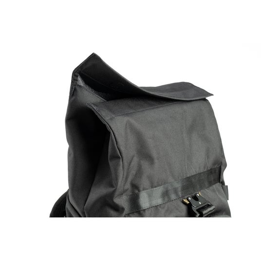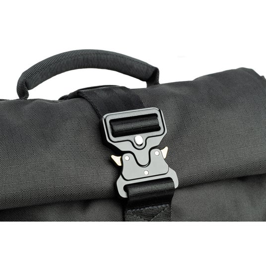 バッグの上部は容量を拡張できるロールトップ型で、ジャケットなど嵩張るアイテムの収納に最適です。ロールトップ部分はマグネットによる開閉、またロール後はパラシュート式クイックリリースバックルでしっかりと固定でき、使い勝手と安全性を両立しています。