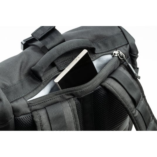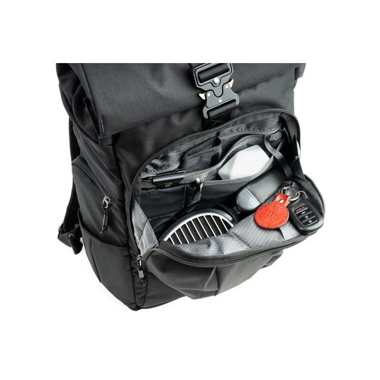カメラ収納部のメインコンパートメント内にはAirTag / Tile用の隠しポケットとジッパー付きポケットがあり、ロールトップ内にはノートPC用のスリーブとベルクロで留められるポケットも設けられています。