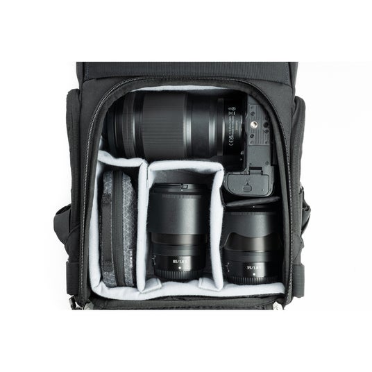 カメラを収納するメインコンパートメントにはクッション性のあるディバイダー付きのインサートが備えられており、機材を安全に収納できます。機材収納部のバックパネル、またサイドパネルからアクセスが可能で、バッグをおろさずに素早く機材を取り出せます。