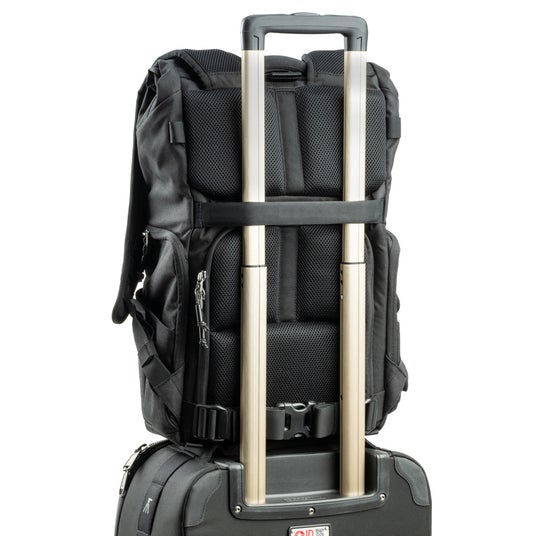 バックパネルには通気性の高いエアメッシュとクッションフォームを備え、快適な背負い心地を実現します。また、背面にはパススルーを搭載。ローリングケースのハンドルに通して持ち運べるため、移動時の負担を軽減します。