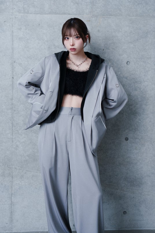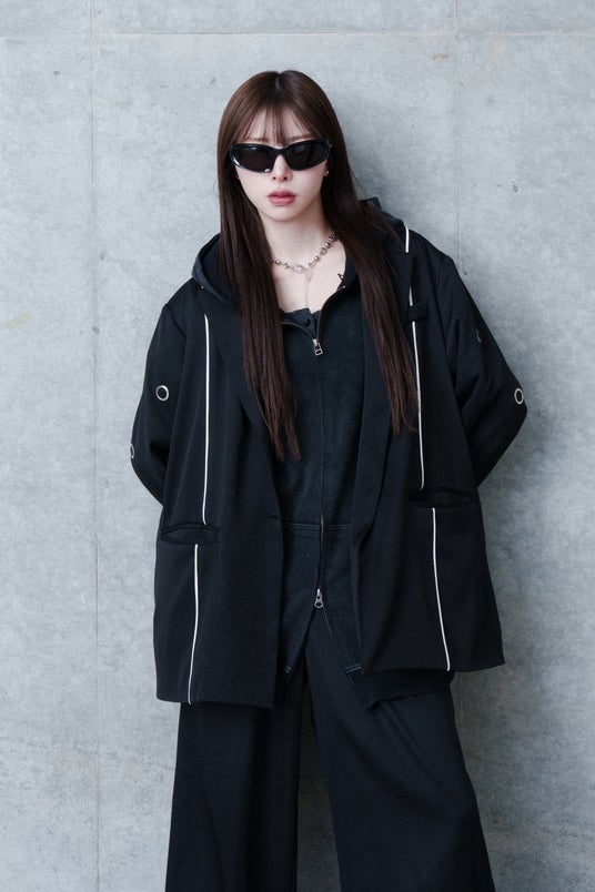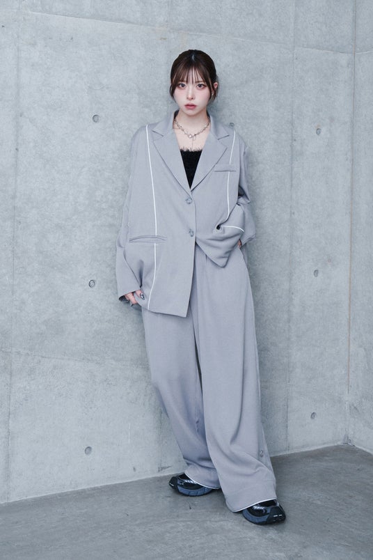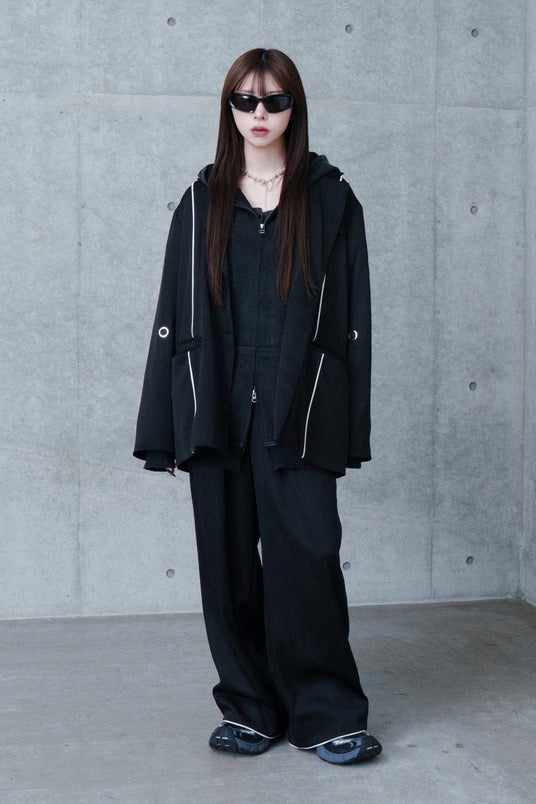 トレンドのオーバーサイズなSETUPはリラクシングな印象を与えながらもパイピングとハトメを使用したデザインで、スタイリッシュに仕上げております。