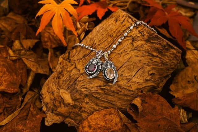 左:朱雀ペンダントw/ロードライトガーネット¥93,500(税込) 右:朱雀ペンダントw/ゴールデンルチル・ゴールデンダイヤモンド¥60,500(税込) ※チェーンは別売りです。