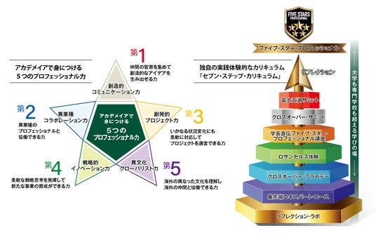 21世紀アカデメイアでは、この人材を「ファイブ・スター・プロフェッショナル」(Five Stars Professional)と名付け、その育成のための独自の実践体験的なカリキュラム、「セブン・ステップ・カリキュラム」を開発し、すべての学生に提供しています。