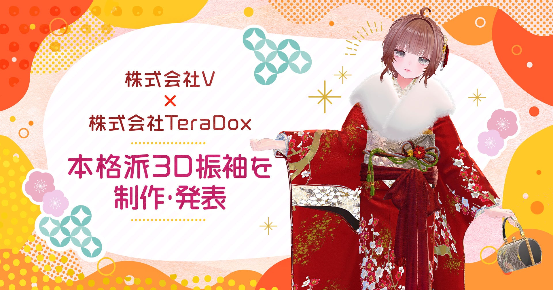 株式会社V(本社:東京都品川区、代表取締役兼CEO:藤原光汰、以下 V)は、日本最大級の振袖・はかまポータルサイトを運営する株式会社TeraDox(本社:東京都渋谷区、代表取締役:齋藤啓司、以下 TeraDox)が発表するVRChat向け本格振袖プロジェクト「Kimonowa」において、制作ディレクションを担当いたしました。