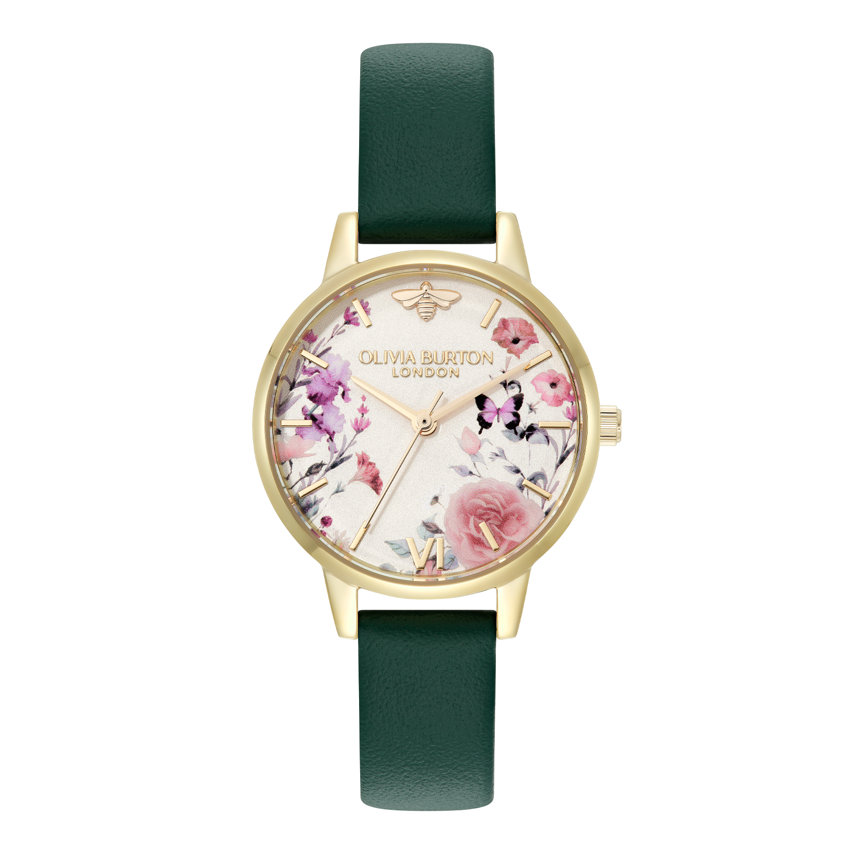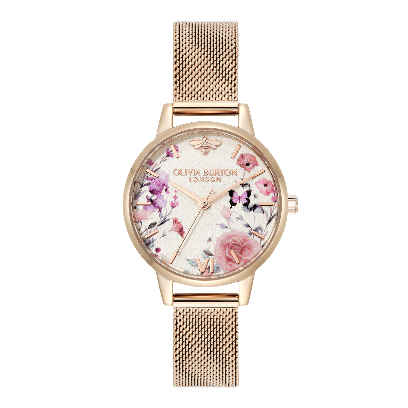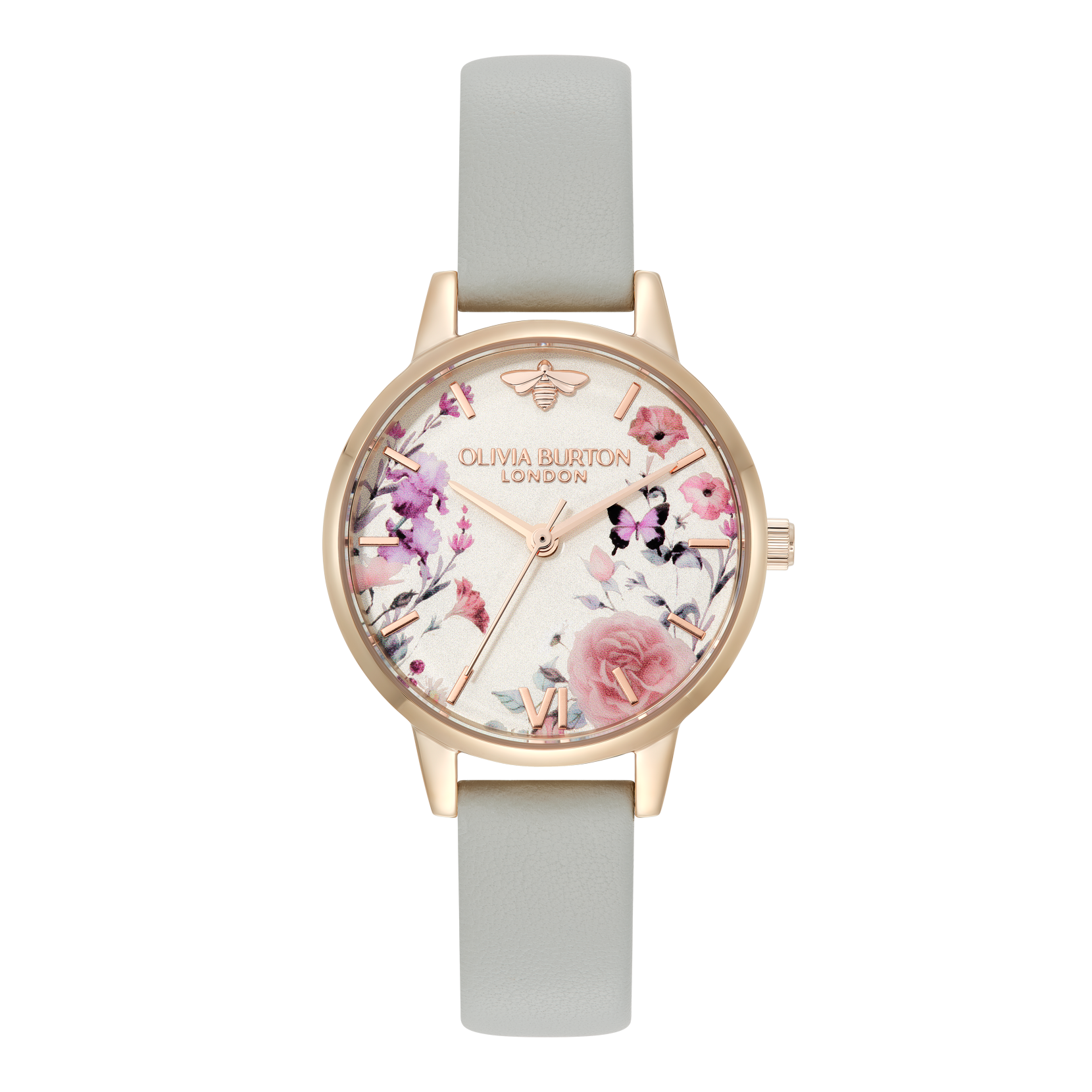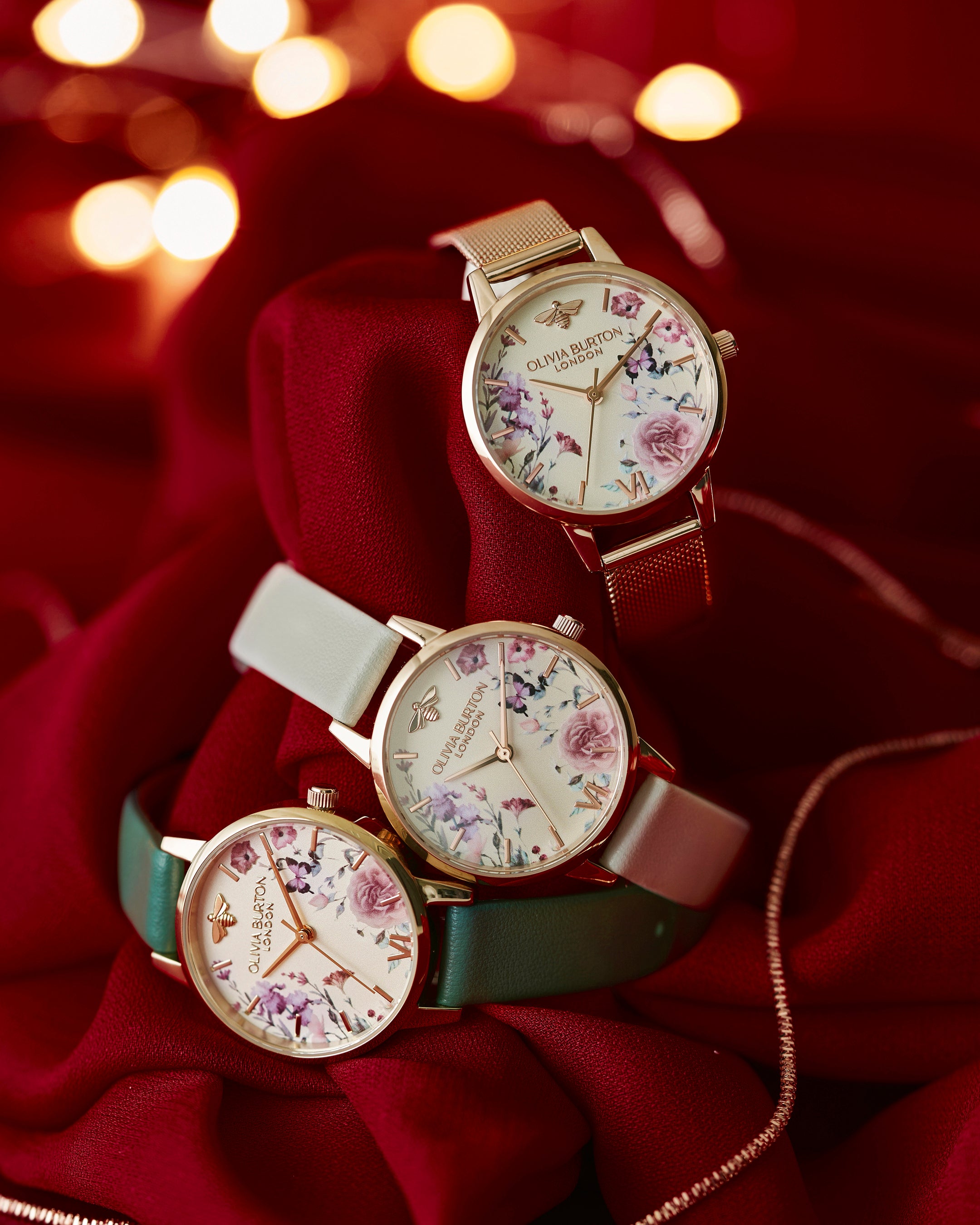 ブランドを象徴する繊細な手描きのフラワーモチーフが、まるで冬の庭の花々をそのまま閉じ込めたように文字盤いっぱいに広がり、柔らかな光をまとって手元を彩ります。立体的な蜂のモチーフを12時位置に配したアイコニックなデザインは、可憐さの中にさりげない遊び心を添え、見るたびに心ときめく仕上がりに。ライトグレーレザーにローズゴールドを合わせた優しい輝き、深みのあるフォレストグリーンとクラシカルなゴールドの組み合わせ、そしてローズゴールドメッシュが放つフェスティブな華やかさ。3つのバリエーションが、それぞれ異なる個性で冬の装いを引き立てます。花の美しさ、自然の息づかい、そして英国らしいロマンティシズム。オリビア・バートンが描く「冬の庭」は、手元に小さな物語を咲かせます。