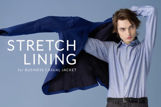 このたびリリースの裏地「ストレッチジャージー」は、ビジネスカジュアルセットアップ、およびビジネスカジュアルジャケットのなかでも、高いストレッチ性を備えた生地にのみ選択いただけます。
