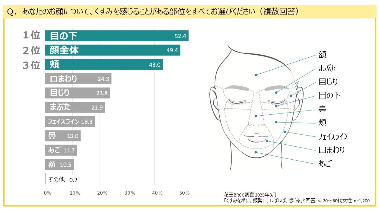 くすみを感じる顔の部位を複数選択してもらったところ、1位「目の下」(52.4%)、2位「顔全体」(49.4%)、3位「頬」(43%)という結果に。また、最もくすみを感じる部位(単一回答)の結果は、1位と2位が入れ替わり、1位「顔全体」(34.5%)、2位「目の下」(28.5%)、3位「頬」(20.3%)となりました。どの年代も上位3部位は同じでしたが、20代は他の年代に比べて「口まわり」を選択する人が多いこともわかりました。