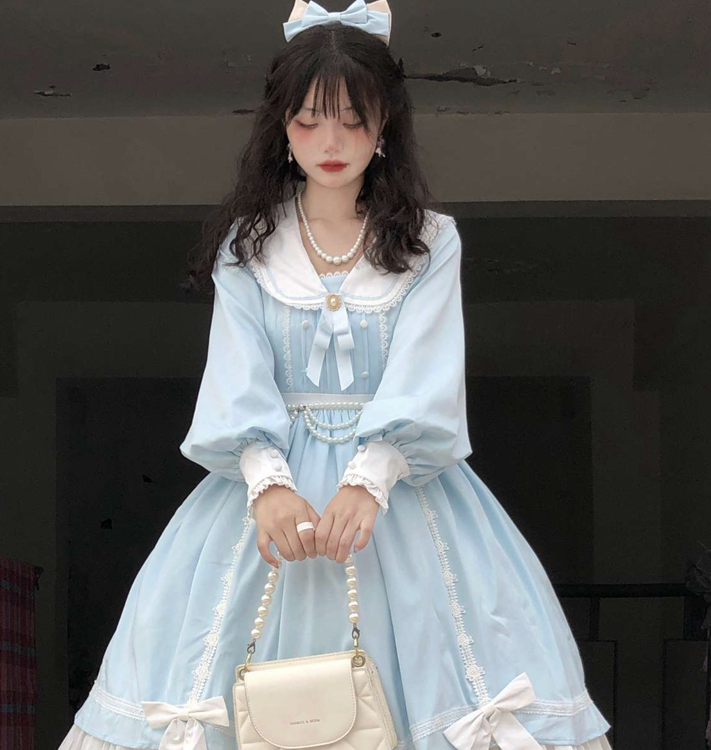 ふんわりとした袖と裾のフリルが特徴的な上品なワンピース。襟元や腰周りの真珠装飾やリボンがアクセントに。胸元の大きな襟と繊細なレース使いが甘さを演出しています。