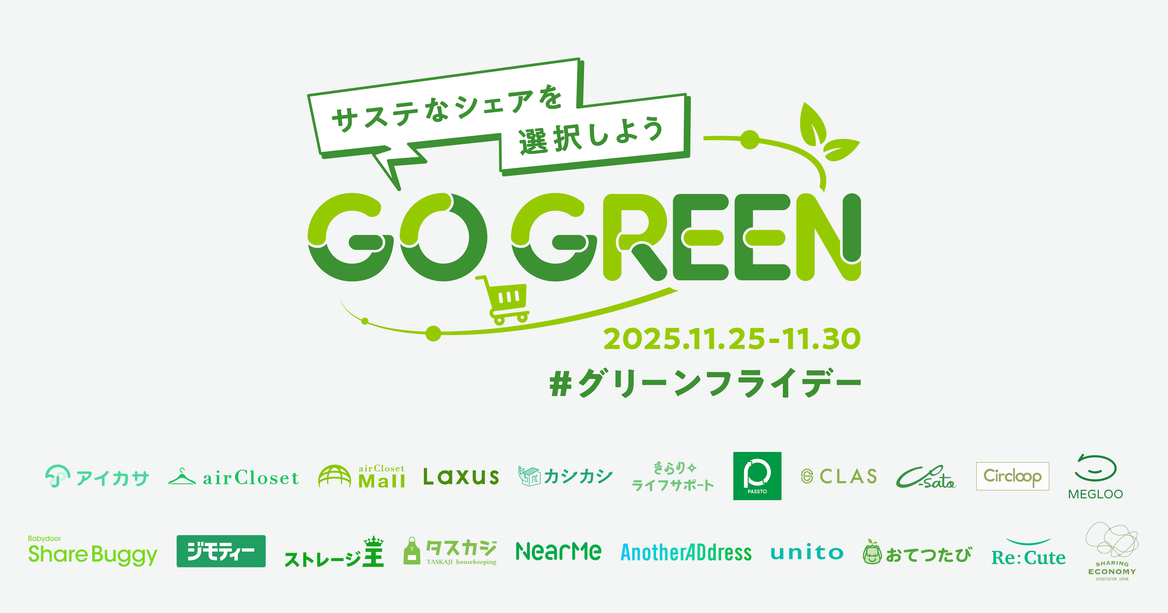 株式会社エアークローゼット(本社:東京都港区、代表取締役社長 兼 CEO:天沼 聰)は、サステナブルな消費のムーブメントであるグリーンフライデー(11月29日金曜日)に合わせ、一般社団法人シェアリングエコノミー協会様(以下、シェアエコ協会様)およびシェアリングサービス事業者19社とともに、環境に配慮した持続可能な消費行動について考える「GO GREEN プロジェクト」を実施します。