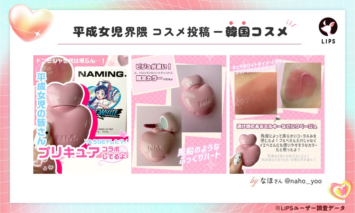 平成女児に人気のキャラクター『プリキュア』とコラボした韓国コスメブランド「NAMING.」の『ネーミング グロウ ハートリップティント』に関する投稿も数多く観測。