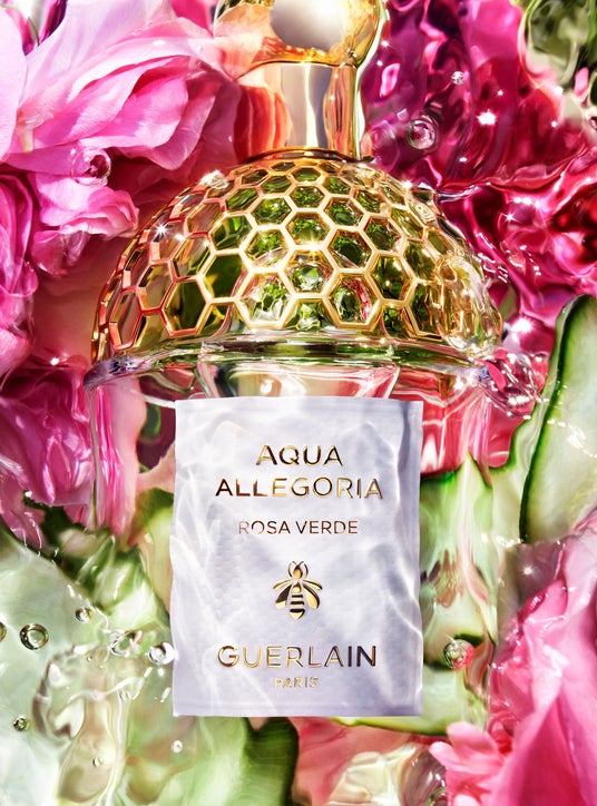 〈ローザ ヴェルデ〉の中心で輝くのは、ゲランを象徴するゲルリナーデのひとつであり、無数の香りのファセットを持つローズ。ローズ エッセンスの自然なみずみずしさと、キューカンバーエキスのボタニカルでアクアティックなファセットが、ミントのアクセントで強調されます。