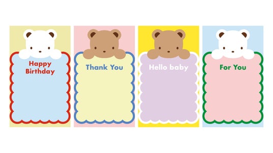 アの代表的なクマちゃんのカラフルなデザインで、「Happy Birthday」「For You」などギフトシー