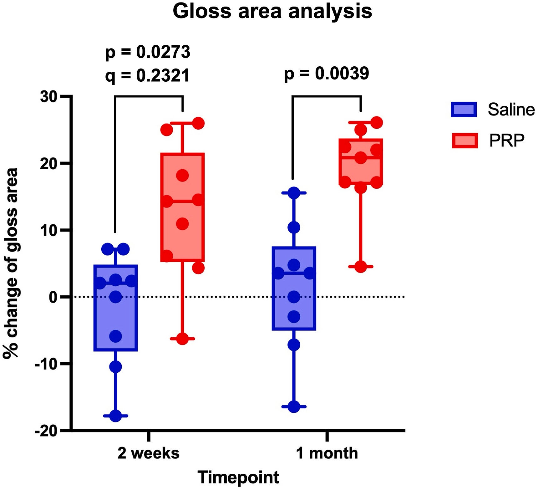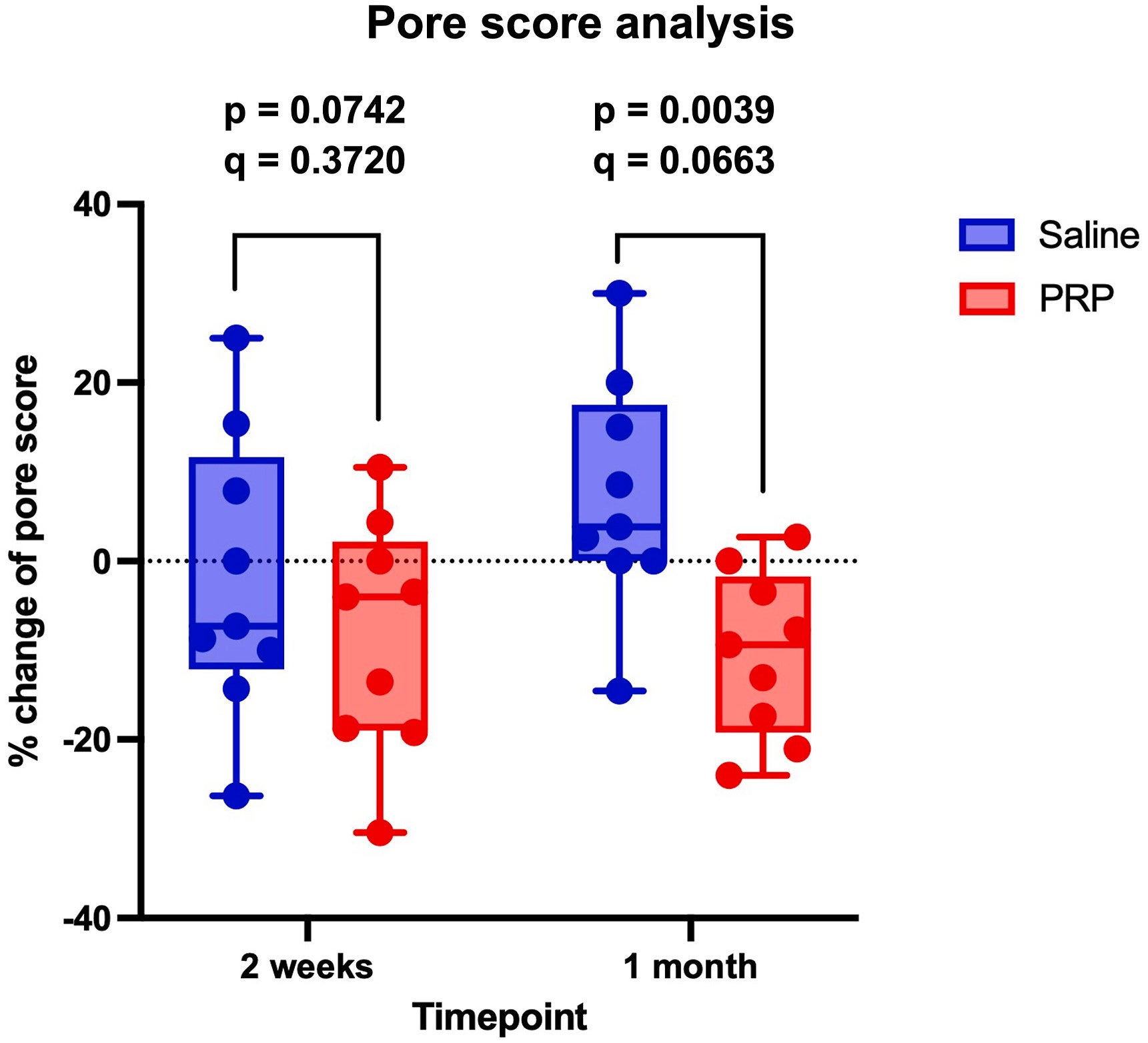 主要評価項目である肌の光沢面積は、投与1か月後にPRP注入側で有意な改善(中央値差+16.3%, p=0.0039)を示しました。この有意な改善は、すでに投与2週間後の時点で改善傾向(p=0.0237, q=0.2321)として現れており、PRPによる皮膚光沢の早期的かつ持続的な改善効果を示唆する結果となりました。 副次的・探索的評価項目では、毛穴スコアにおいてPRP側で改善傾向(p=0.0039)を認めましたが、FDR補正後には統計的有意性を維持しませんでした(q=0.0663)。 その他の指標(シワ、メラニン、色素沈着など)では統計学的有意差はみられませんでしたが、一部の症例では局所的な改善傾向が観察されました。 有害事象については、両側ともに軽度の紅斑や腫脹など一過性の局所反応のみであり、 重篤な副作用は認められませんでした。