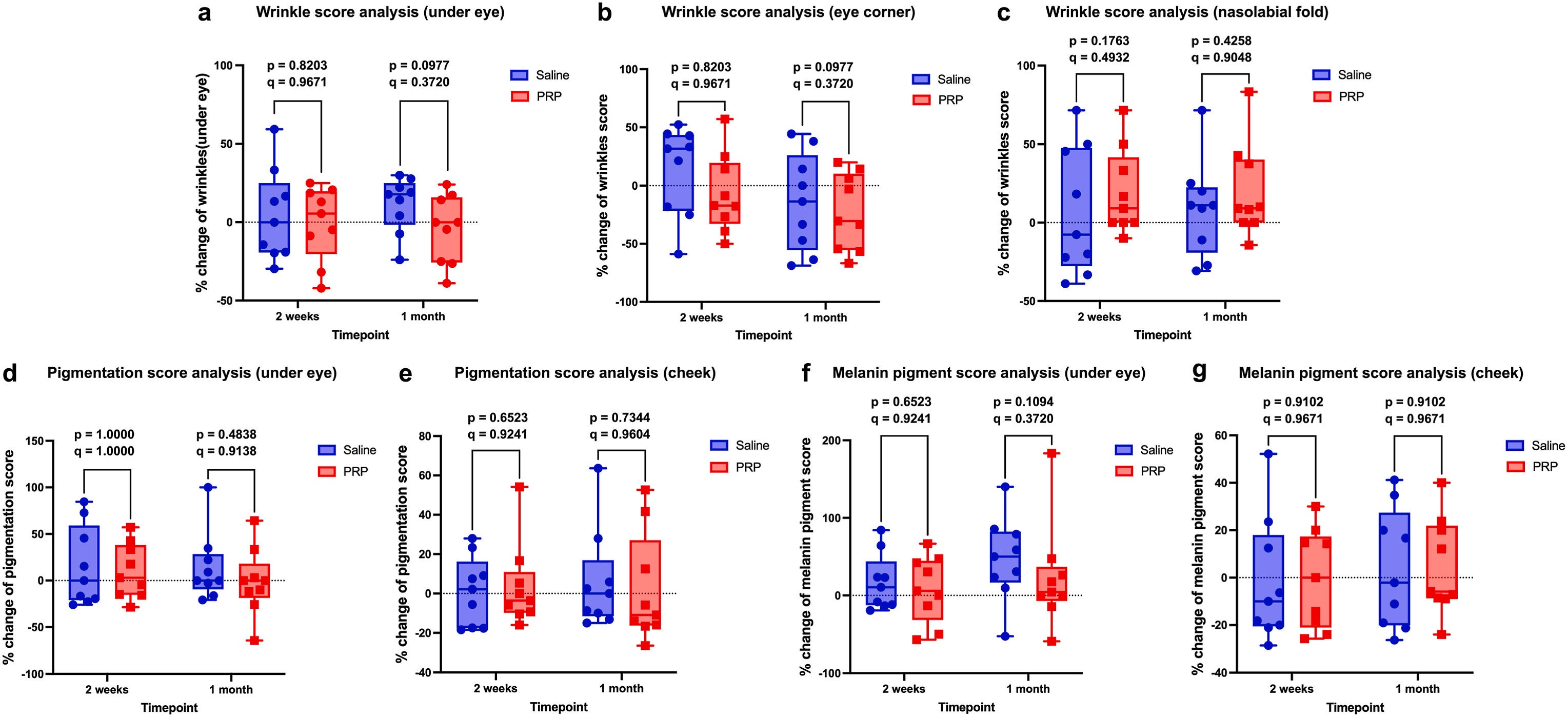 本研究は、健常成人9例(女性6例、男性3例)を対象に実施された、スプリットフェイス自己対照デザインの前向き臨床研究です。 左半顔にPRP(多血小板血漿)、右半顔に生理食塩水を同条件・同容量(各5 mL)で注入し、投与前、2週間後、1か月後に高精度画像解析システム(NeoVoir(R), C-Lab, Tokyo)を用いて撮影・解析を行いました。NeoVoir(R)は自動的に抽出した顔面の領域別に光沢、毛穴、シワ、メラニン、色素沈着などの定量的皮膚パラメータを抽出・数値化します。
