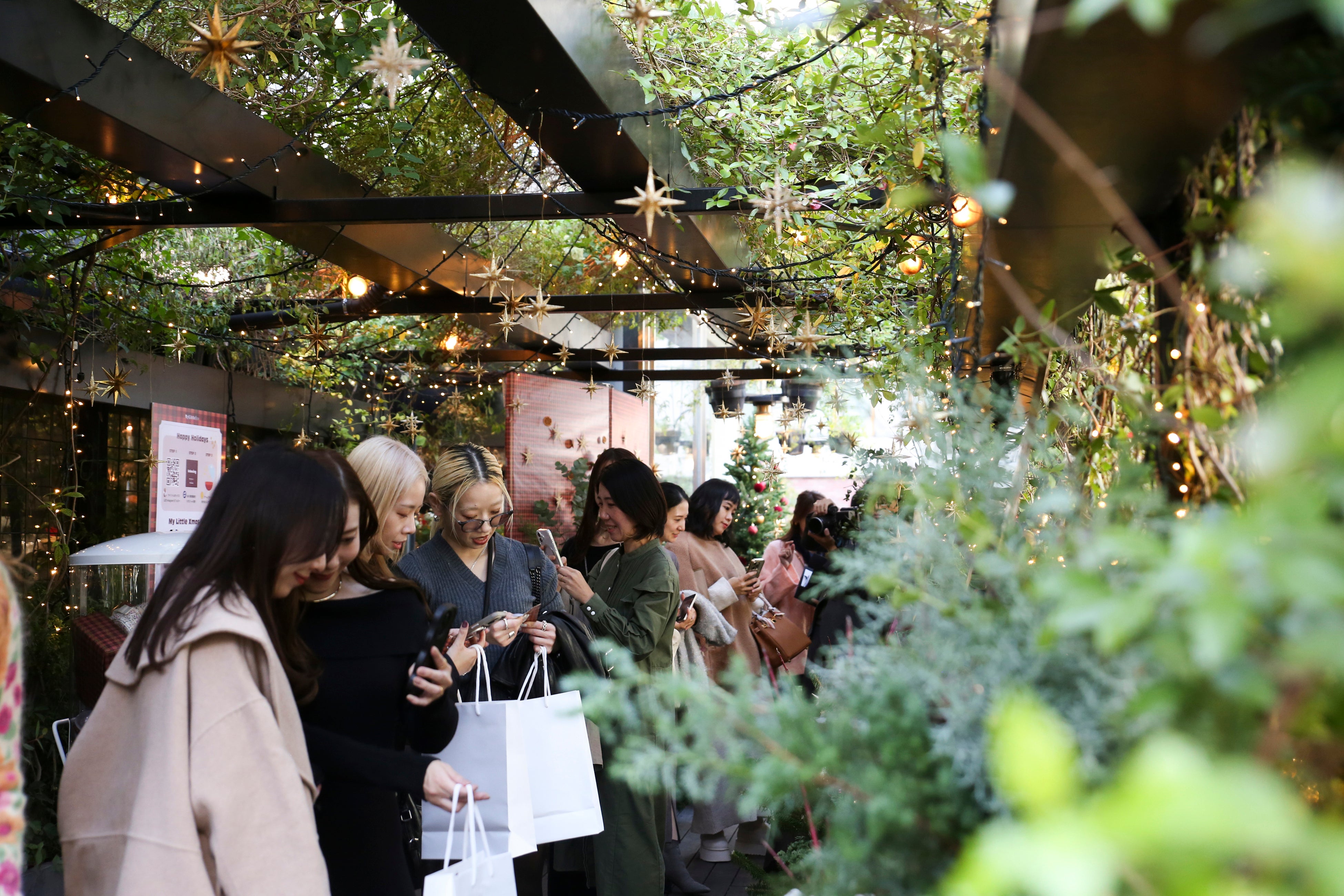 表参道に突如登場したパリのガーデンクリスマス会場には、「ちょっと早めのガーデンクリスマス」をお楽しみいただくため、多彩なコンテンツ演出で来場者をお迎えしました。来場者の9割は女性で、カップルや夫婦、家族連れのほか、著名なインフルエンサーも多数来場。当日は開場前から行列ができるなど、コスメ好きでファッション感度の高い女性たちで終日賑わいを見せました。【イベントの様子】
