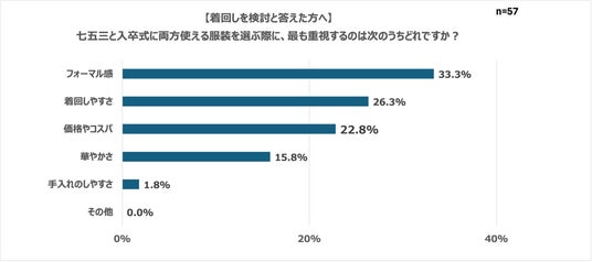また、七五三用の服の着回しを検討していると答えた人の中でも、「七五三と入卒式に両方使える服装を選ぶ際に、最も重視するのは次のうちどれですか?」には「フォーマル感」が33.3%と最も多く、全体として「フォーマル感」が重視されていることがわかりました。