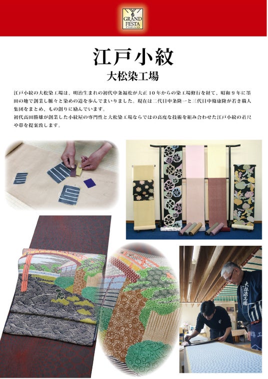 初代・中条福松が大正10年より染工場で修行を重ね、昭和9年に創業した老舗です。現在は二代目・中条隆一と三代目・中條康隆が若き職人集団を率い、伝統を受け継ぎながらものづくりに励んでいます。小紋屋の専門性と、大松染工場ならではの高度な染色技術を融合させた江戸小紋の着尺や帯を提案しています。
