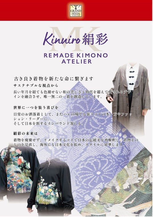 絹彩は、古き良き着物に新たな命を吹き込むリメイクブランドです。サステナブルな視点から、時代を超えて愛される和の美しさとデザインを融合させ、唯一無二の一着を創造。国内外のファッション感度の高い方々からも注目を集めています。着物を廃棄せず、新たな視点で再構築することで、日本の伝統美を未来へと継承し、世界へ発信しています。