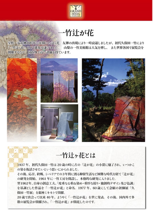 一竹辻が花は、室町~安土桃山時代に栄えた辻が花染を、初代久保田一竹が独自の技法と美意識で再興・進化させた染色芸術です。20歳で古裂に魅了された一竹は、戦争や抑留を経て1961年に工房を開設。翌年「一竹辻が花」と命名し、重ね染めや絞り、独創的な色彩で唯一無二の作品を生み出しました。国内外で展覧会を開催し、高い評価を得ています。