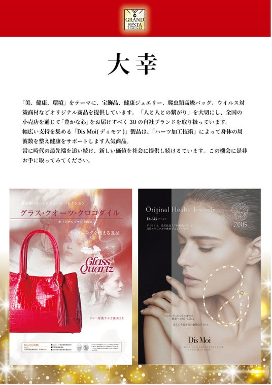 大幸は、「美・健康・環境」をテーマに、宝飾品、健康ジュエリー、爬虫類高級バッグ、ウイルス対策商材など、独自の視点で開発したオリジナル商品を提供しております。「人と人との繋がり」を大切にしながら、30の自社ブランドを展開しています。中でも幅広い支持を集める「Dis Moi(ディモア)」製品は、独自の「ハーツ加工技術」により身体の周波数を整え、健康をサポートする人気商品。