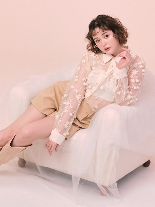 商品名:Anewsta 女性用エレガントなあんず色半透明3Dフラワー襟ブラウス