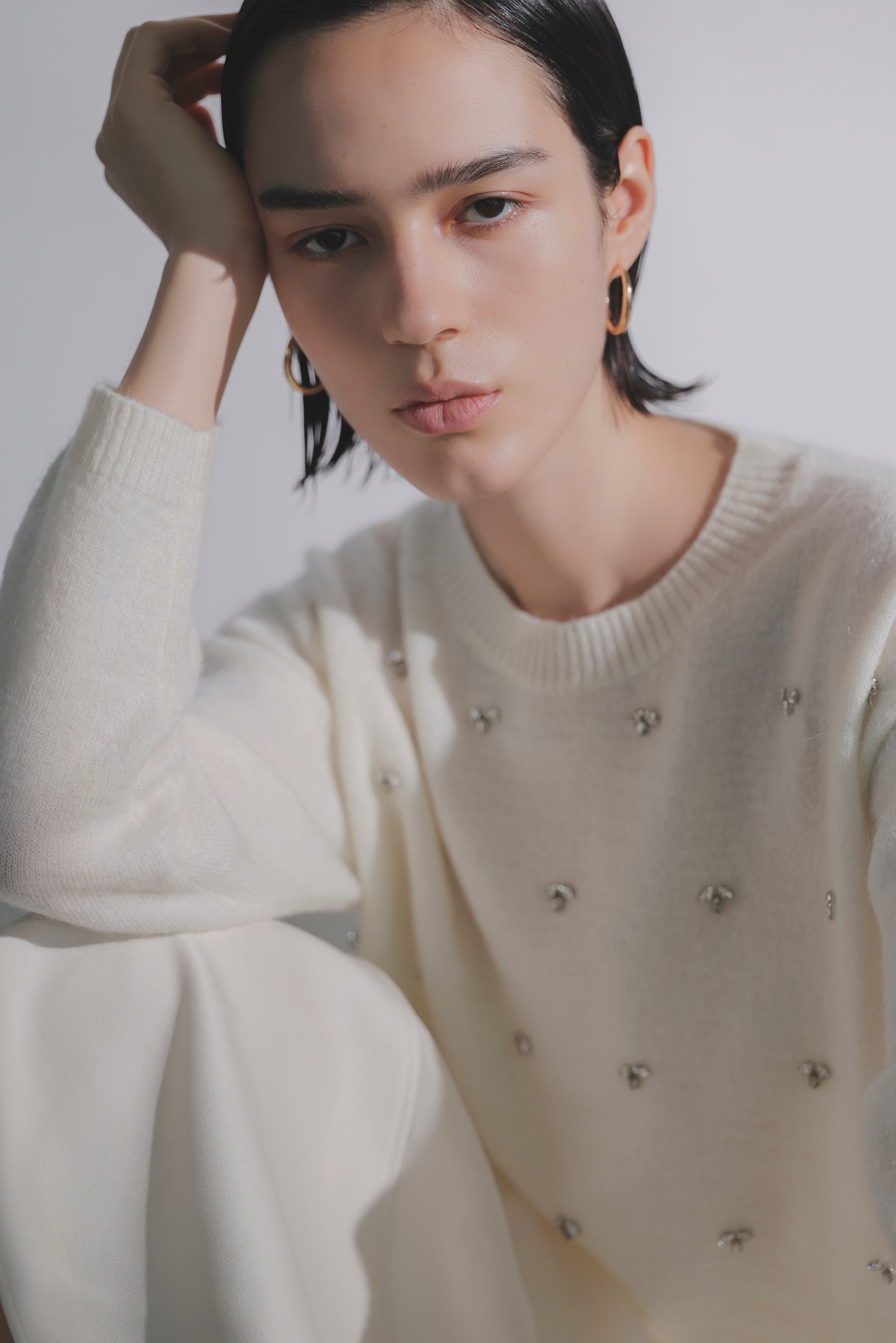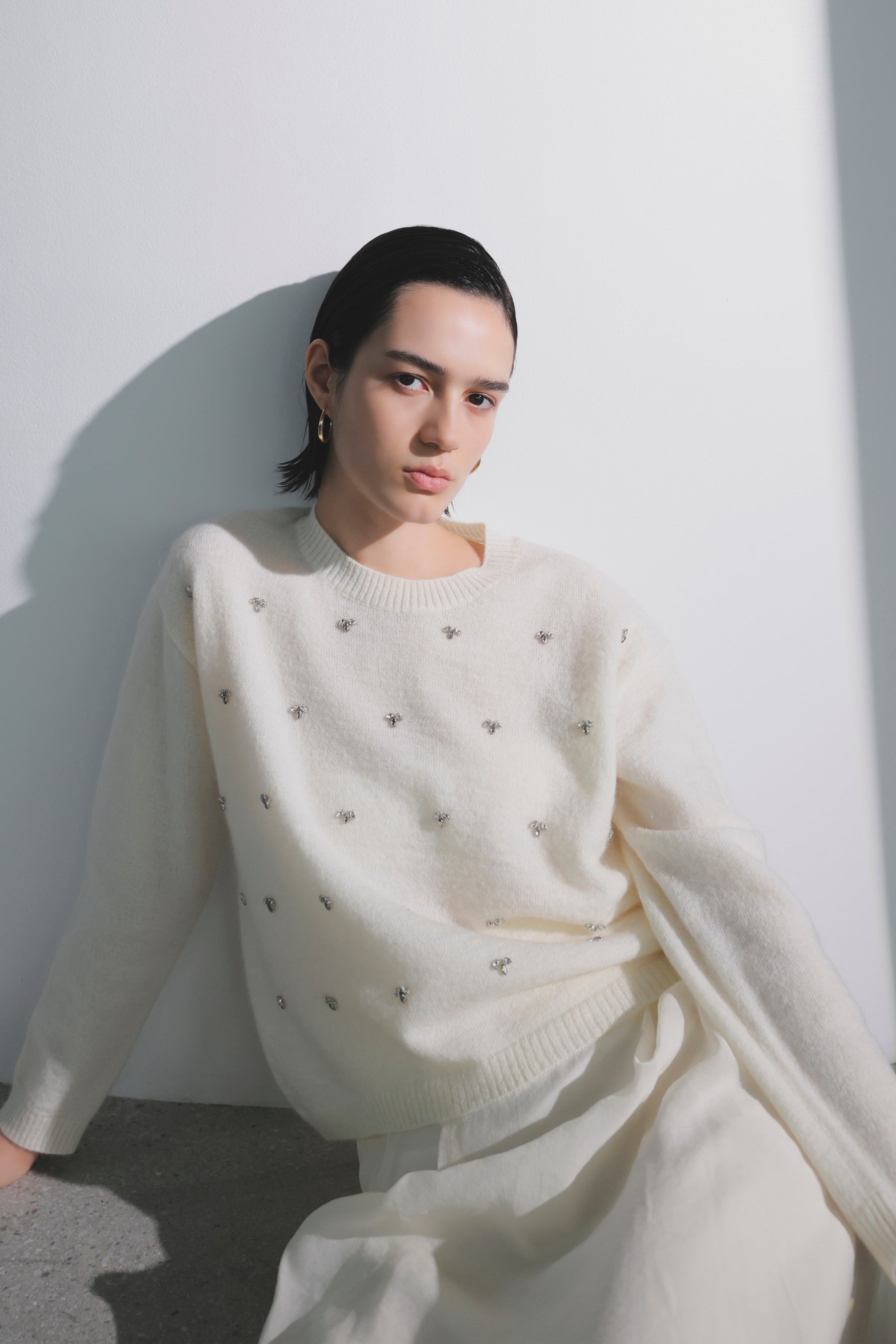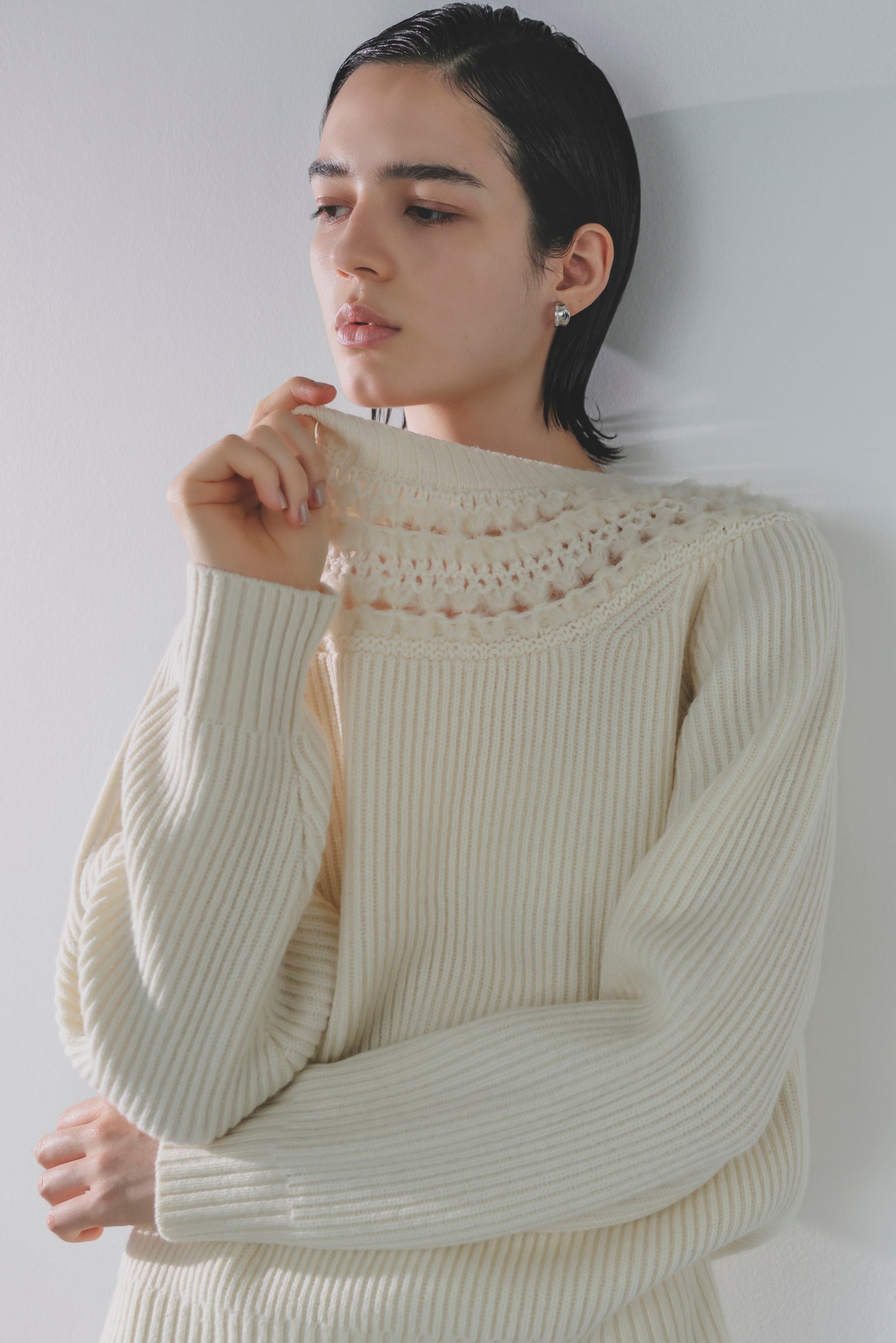 白を主役に、クリーンでエレガントなスタイルを提案。ベロアやレース柄ニットなど、異素材の白を重ねて魅せる洗練の着こなしに加え、白に映えるカラーや柄物も展開します。
