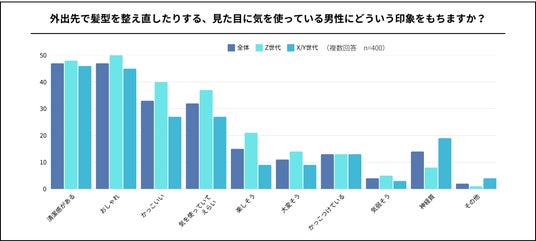 また髪を整え直すなど身なりに気を使っている男性に対する印象は、「かっこいい」「清潔感がある」などの回答が多く、逆に「かっこつけている」と回答した人はわずか12.8%となっており、ほとんどが好印象であることが明らかになりました。