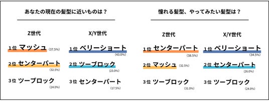 一方でX/Y世代では、ともに「ベリーショート」が1位という結果に。憧れる髪型ではX/Y世代でも「センターパート」が2位にランクインしていることから、広い世代でセンターパートに憧れる人が多いことが分かります。