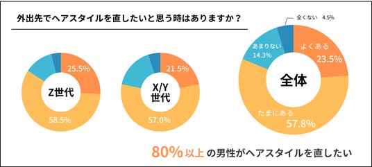 本調査で、男性の8割以上が外出先でヘアスタイルを整え直したいと思っていることが分かりました。Z世代男性に人気の「マッシュ」「センターパート」などのヘアスタイルが、ガチッと固めるスタイルではなく、ナチュラルで崩れやすいということが、その要因のひとつであると考えられます。