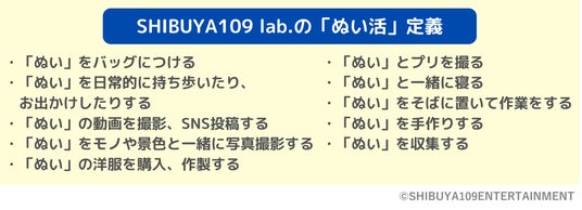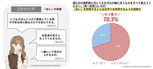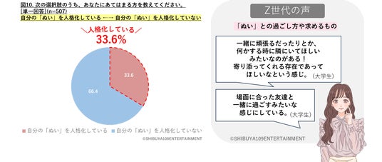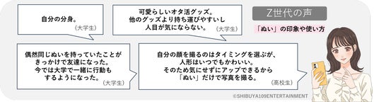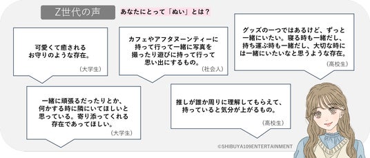 株式会社SHIBUYA109エンタテイメント(本社:東京都渋谷区、代表取締役社長:石川 あゆみ)が運営する若者マーケティング機関『SHIBUYA109 lab.(読み:シブヤイチマルキュウラボ)』は、15~24歳の女性507名を対象に、外部調査パネルによるWEB調査とSHIBUYA109 lab.独自ネットワークによるインタビューから「Z世代のぬい活に関する実態調査」を行いました。
