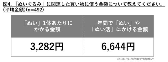 「ぬい」1体あたりにかける平均金額と、年間でぬい活にかける金額(収納やぬいの洋服等)関連で年間にかける平均金額を質問したところ、下記のような結果となりました(図4) 。