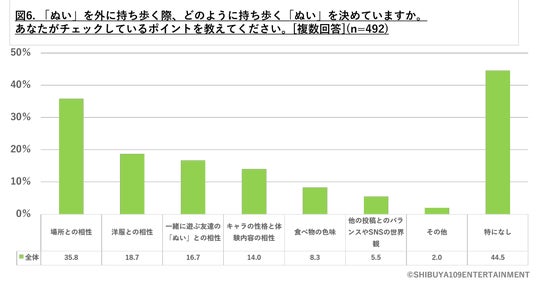 「ぬい」をどこかへ連れて行く際に決め手となる要素を質問したところ、「特になし」が44.5%、次いで「場所との相性」が35.8%、「洋服との相性」が18.7%、「一緒に遊ぶ友達のぬいとの相性」が16.7%となっています(図6) 。