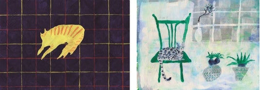 ▲高田昌耶さん「チェックのブランケットの上の猫」(左) をルームウェア(トップス)のデザインに