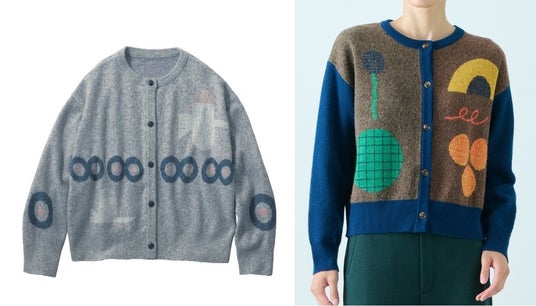 ▲しまむらひかりさん「とりとくだもの」(左) をニットカーディガン、ルームウェア(トップス)、ソックスのデザインに