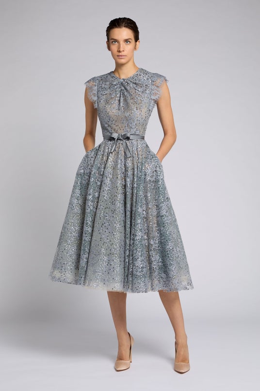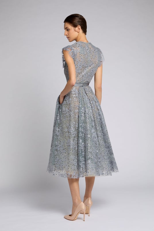 最上級の「ヴァランシエンヌレース」を贅沢に使用した、グレーカラーのミディドレス 。