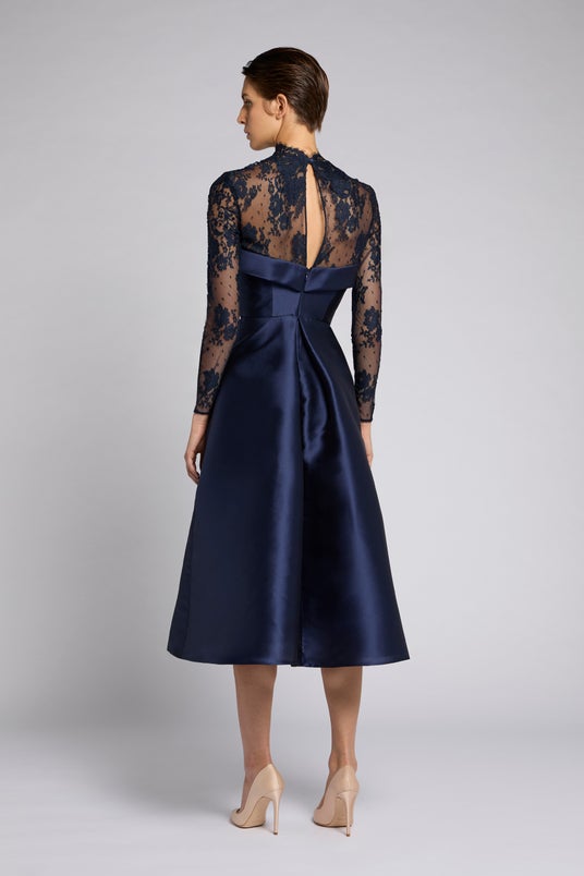 最高級のシルクミカドと、繊細なヴァランシエンヌレースを贅沢に組み合わせたミディドレス 。ANTONIO RIVA MILANOらしい建築的な美しさと、クラシカルなエレガンスが融合した、ゲストドレスの枠を超えた一着です 。
