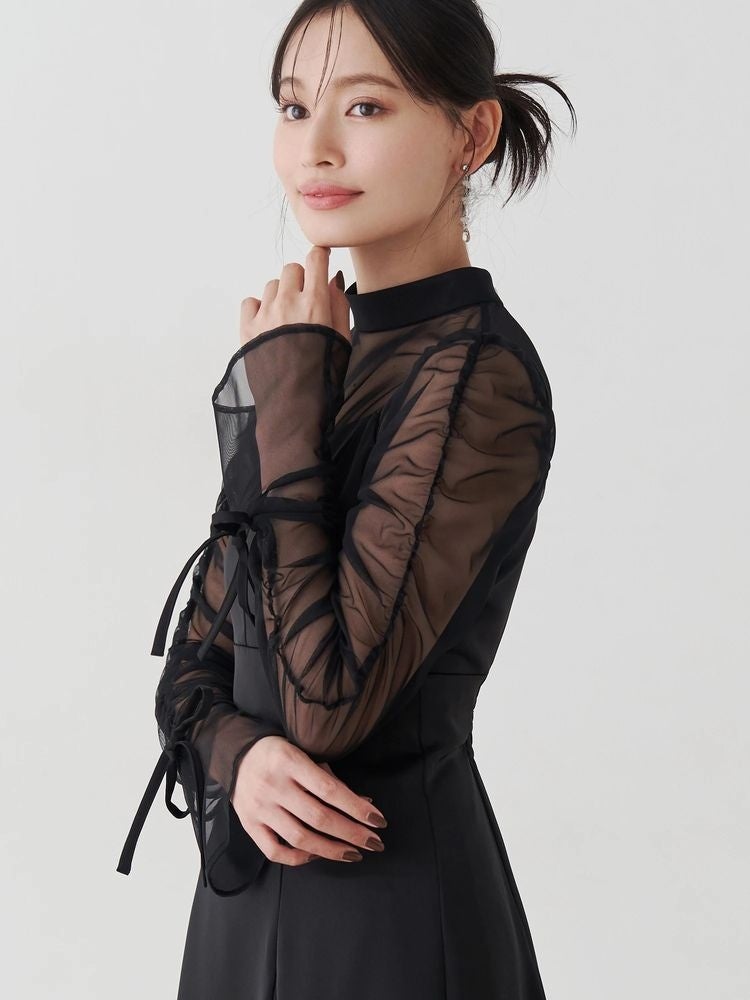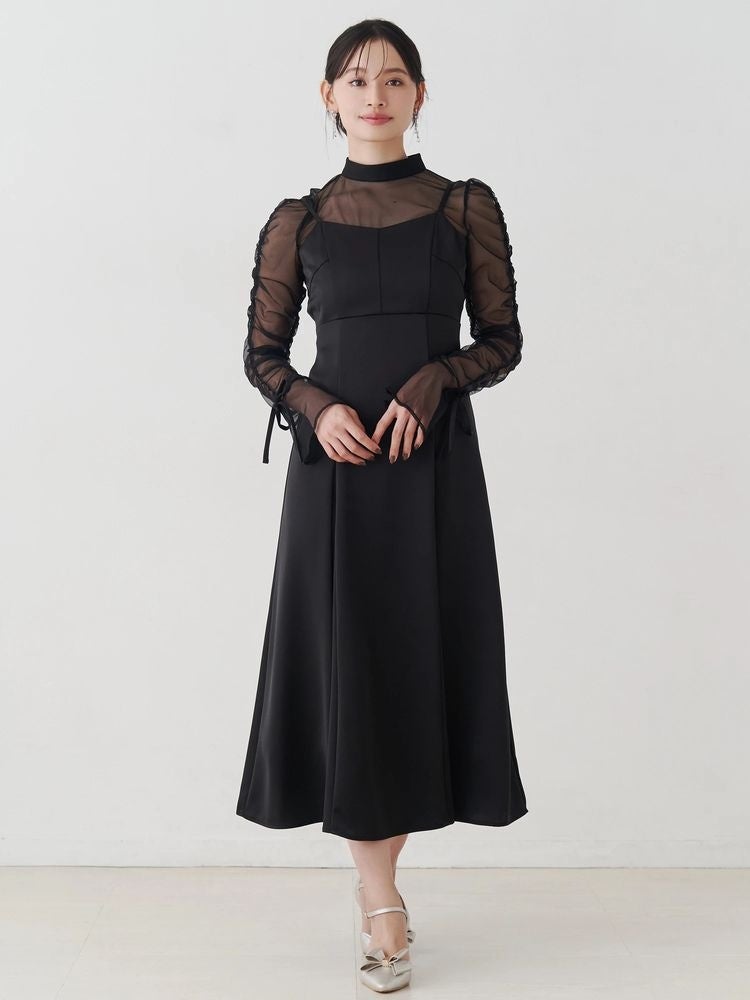 繊細なシアートップスに上品な光沢を放つサテンキャミワンピースを重ねたレイヤード風ワンピース。
