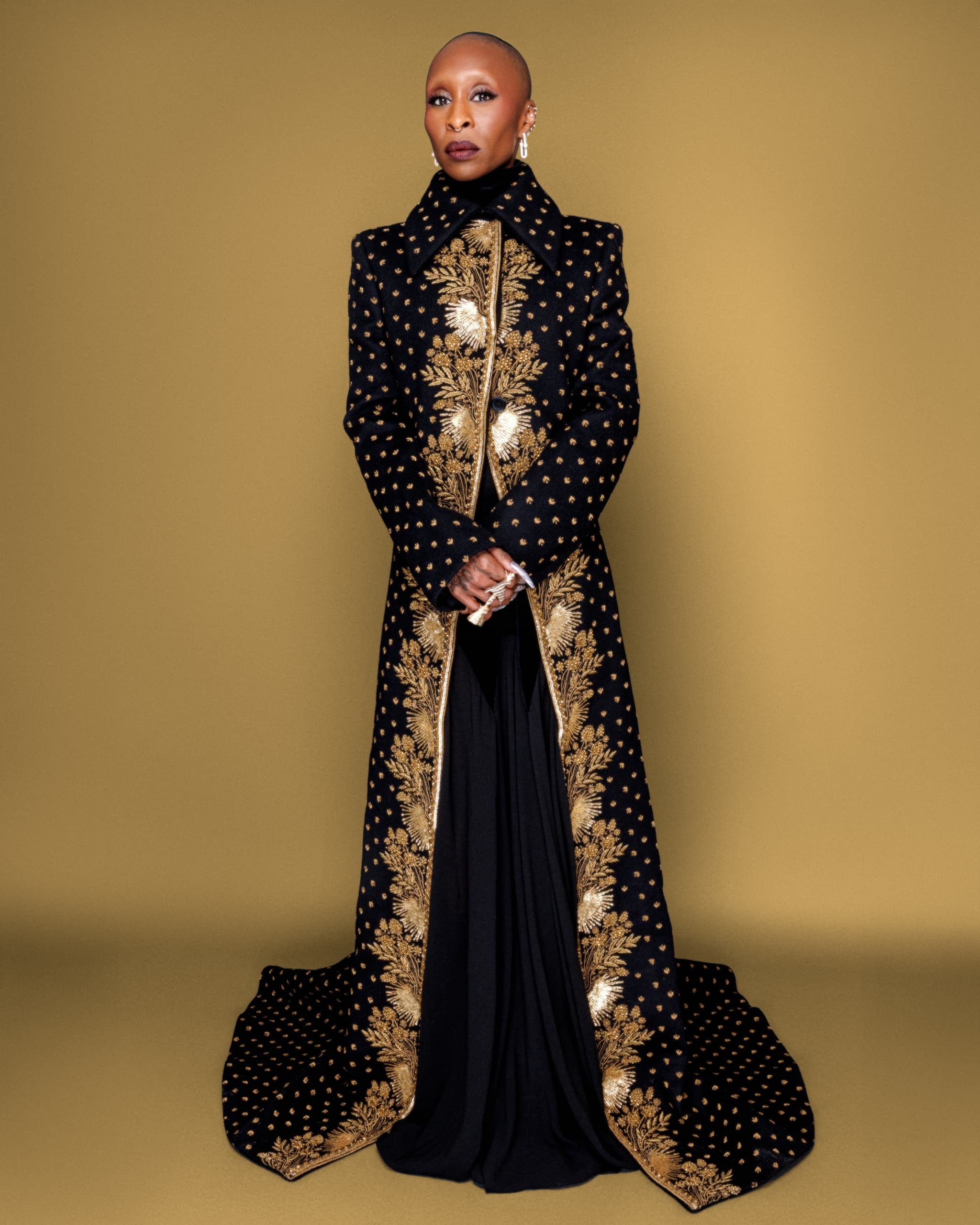 11月6日、ロサンゼルスのドルビー・シアターにて開催された『ウィキッド・スペシャル:忘れられない一夜』パフォーマンスでは、2025年秋冬コレクションより、ゴールドワークのボーダー刺繍を施したブラックウール製スウェプトバック オーバーコートにフローラルレースをあしらったシルクジョーゼット ハイカラードレスを合わせています。