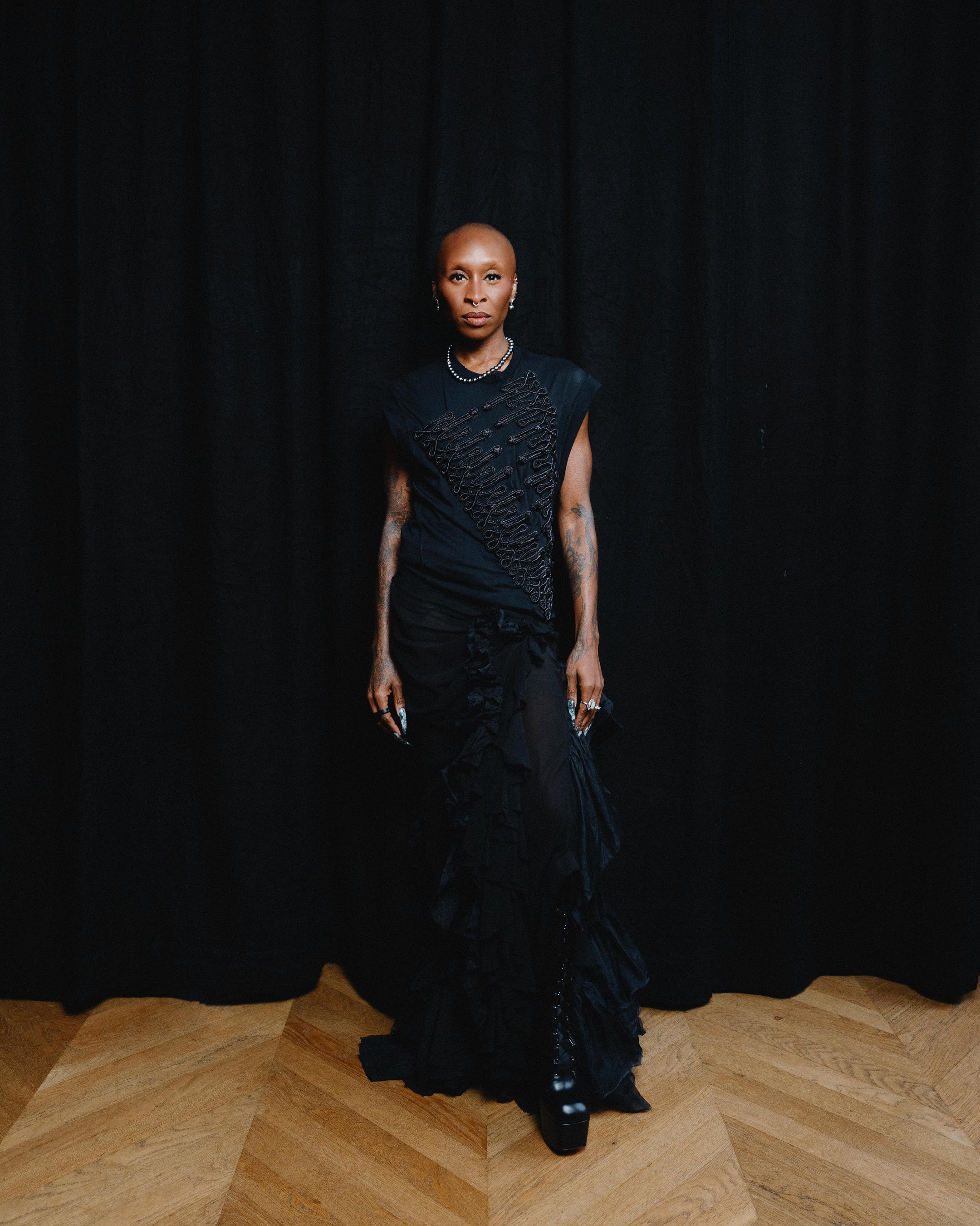 11月8日、パリのパレ・ガルニエにて開催された『ウィキッド』スクリーニングでは、2026年春夏コレクションより、フロッギング刺繍を施したブラックのコットンジャージーツイストタンク、シルクハボタイとオーガンザラッフルをあしらったシルクジョーゼット スパイラルカットスカートを着用しました。