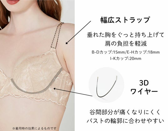 幅広ストラップでバストをしっかり持ち上げて肩への負担を軽減します。カップサイズに合わせ太さが変わるため、どのサイズでも安定感があります。