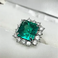 エメラルド E(5.68ct メレダイヤ MD(1.80ct PT900 リングルビーやサファイアと並ぶ3大貴石のエメラルドです。中央のエメラルドもさることながら囲むようにセッティングされたメレダイヤも美しく輝いています。