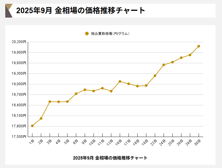 令和7年9月の金相場は1gあたり17,809円でスタート。米連邦公開市場委員会(FOMC)による追加利下げ期待から9/1の初日から前日比で+192円を記録。7月23日以来の史上最高価格となりました。その後も僅か1週間で900円以上の伸びをみせると、9/16には買取価格19,000円を突破。中東情勢やウクライナ戦争による地政学リスク、再びの円安傾向、米政府機関の一部閉鎖など様々な要因を重ねた結果、9/30の最終日は1gあたり20,000円を突破。テレビやインターネットにて大々的に報道されました。