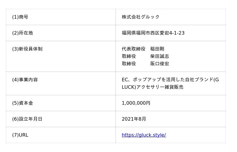 当社の連結子会社である株式会社トライフォース(本社:東京都中央区、代表取締役:稲田 剛)は、2025年12月10日付で締結した株式譲渡契約に基づき、本日、アクセサリーブランド「GLUCK」を展開する株式会社グルック(本社:福岡県福岡市、代表取締役:柴田 誠志 以下、「グルック」)の全株式を取得し、完全子会社化いたしましたので、お知らせいたします。