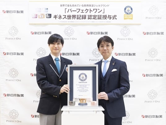 新日本製薬 株式会社(本社:福岡市、代表取締役社長CEO:後藤孝洋)は、スキンケアブランド『パーフェクトワン』が世界で最も売れている顔用保湿ジェルブランドとして、2年連続でギネス世界記録(TM)に認定※1されたことに伴い、2025年1月24日(金)にギネス世界記録(TM)認定証授与式を開催いたしました。当日は、約50名の社員が見守る中、ギネス世界記録公式認定員より代表の後藤に認定証が授与されました。