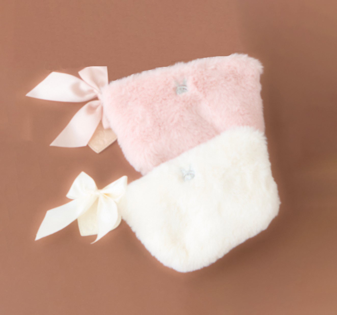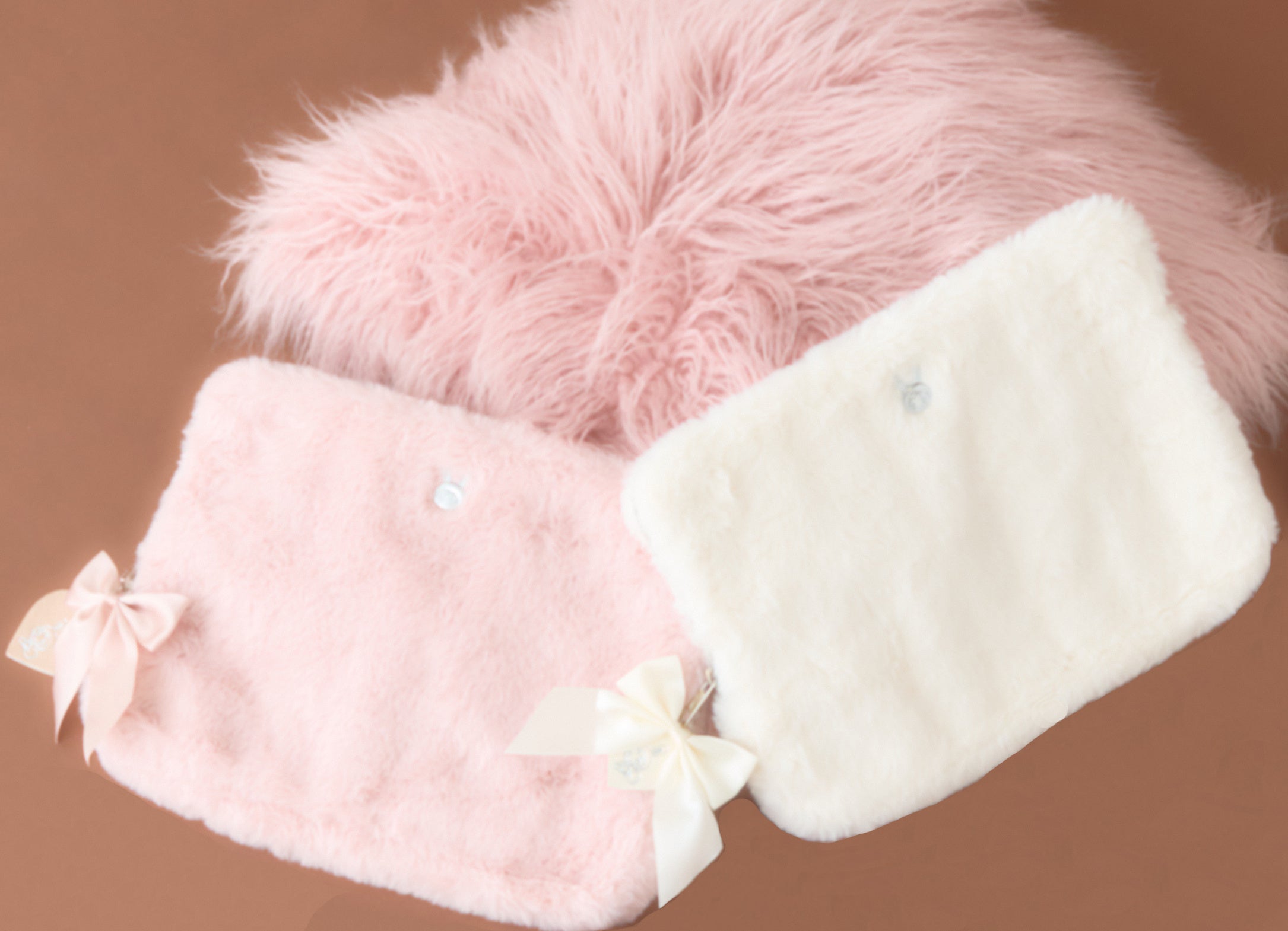 ファー素材にきらめくハートチャームを添えたふわふわポーチ。